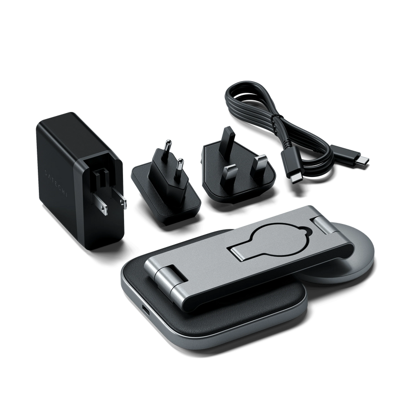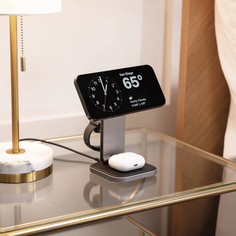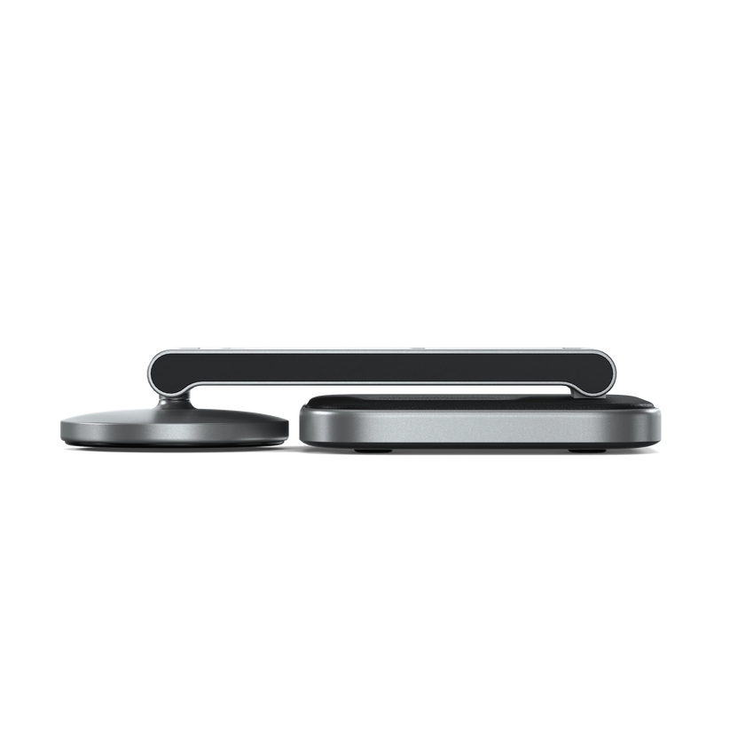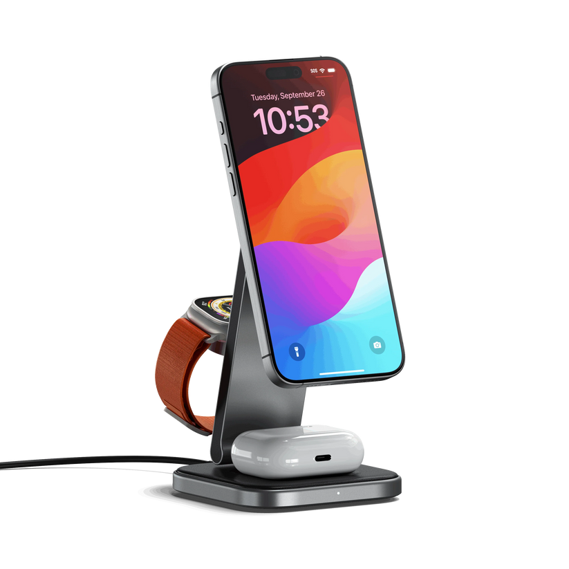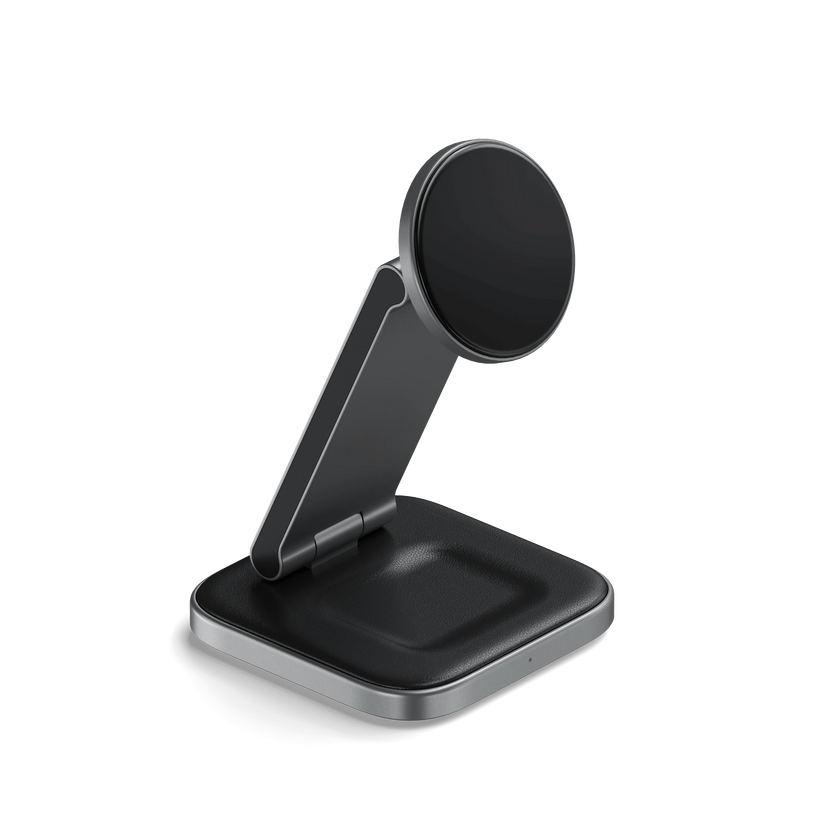 Keep your everyday essentials charged and organized with the Satechi 3-in-1 Foldable Qi2 Wireless Charging Stand. Driven by the latest Qi2 technology, it can simultaneously deliver 15W of power to your iPhone, 5W of power to your AirPods, and 5W of power to your Apple Watch. Its foldable, travel-friendly design features a premium-grade aluminum enclosure, a vegan leather base, a soft silicone charging puck, and sturdy, durable hinges that won’t weaken over time, enabling optimal viewing in both portrait and landscape mode.