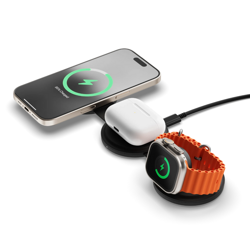 Stay charged and organized with the Satechi OntheGo™ 3-in-1 Charger. Powered by the latest Qi2 technology, it delivers 15W fast charging for your iPhone and 5W for your Apple Watch and AirPods, all in one sleek device. Its foldable design features soft, scratch-resistant premium material accents for a charger as stylish as it is practical. Equally suited for travel, home, or the office, its compact, durable build ensures long-lasting convenience and mobility.