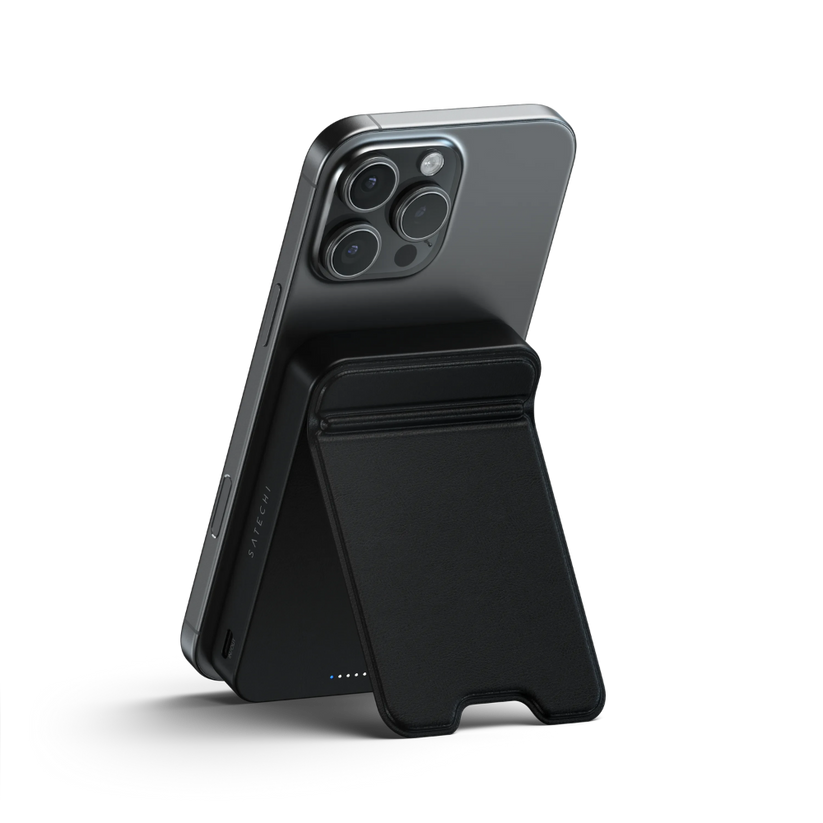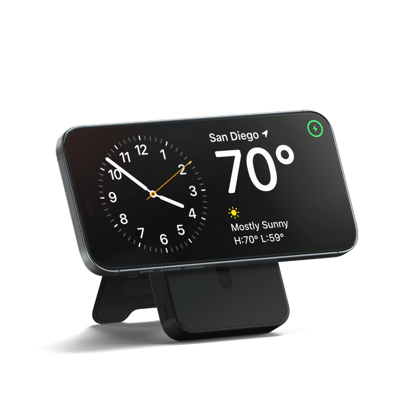Stay powered anywhere with the OntheGo™ Power Bank with Stand. Designed for a mobile lifestyle, its compact and ultra-portable design houses a 10,000mAh battery that delivers 15W fast charging. Charge up to two devices at once—wirelessly power your iPhone while using the USB-C port to charge an additional device. Magnetic attachment ensures easy alignment, and a quick press of the power button starts charging your device instantly. With pass-through charging, charge both your device and the power bank simultaneously. The built-in stand features sturdy, durable hinges that allow for smooth adjustments, giving you the flexibility to find the perfect viewing angle. Slim, lightweight, and stylish, the power bank features an aluminum frame, premium material, and a soft silicone charging surface for precise magnetic alignment. Currently only shipping within the contiguous United States.